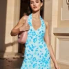 Floral Halter Mini Dress for Women Summer Fashionable Beaded Sleeveless Backless Bodycon Short Dress
