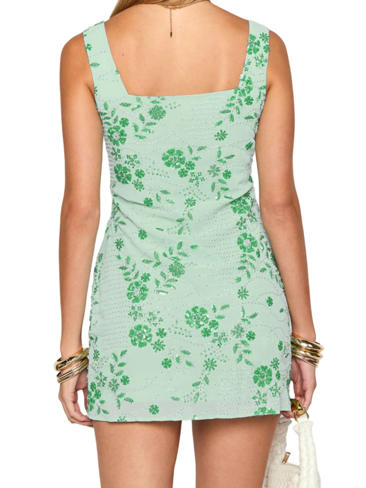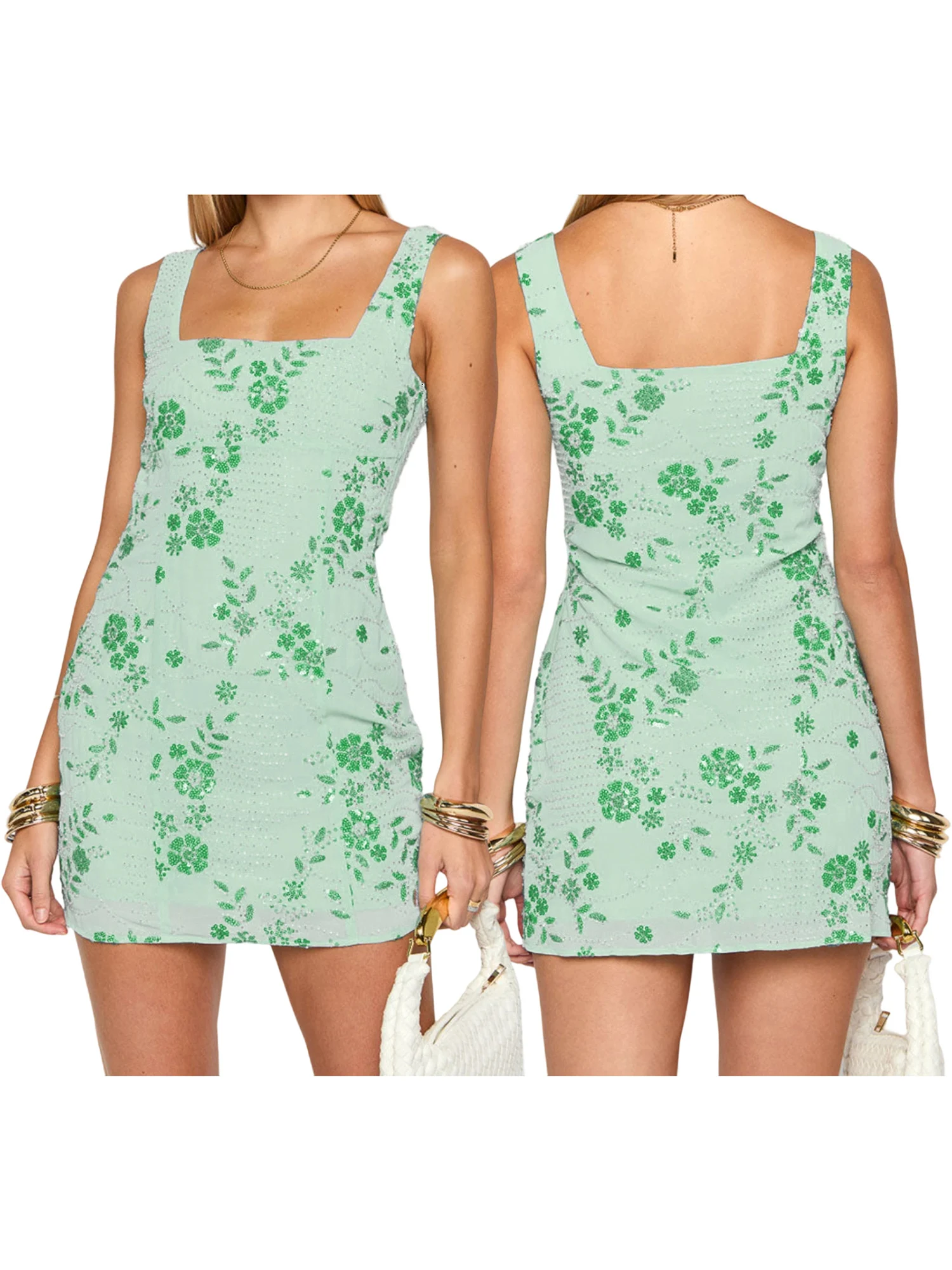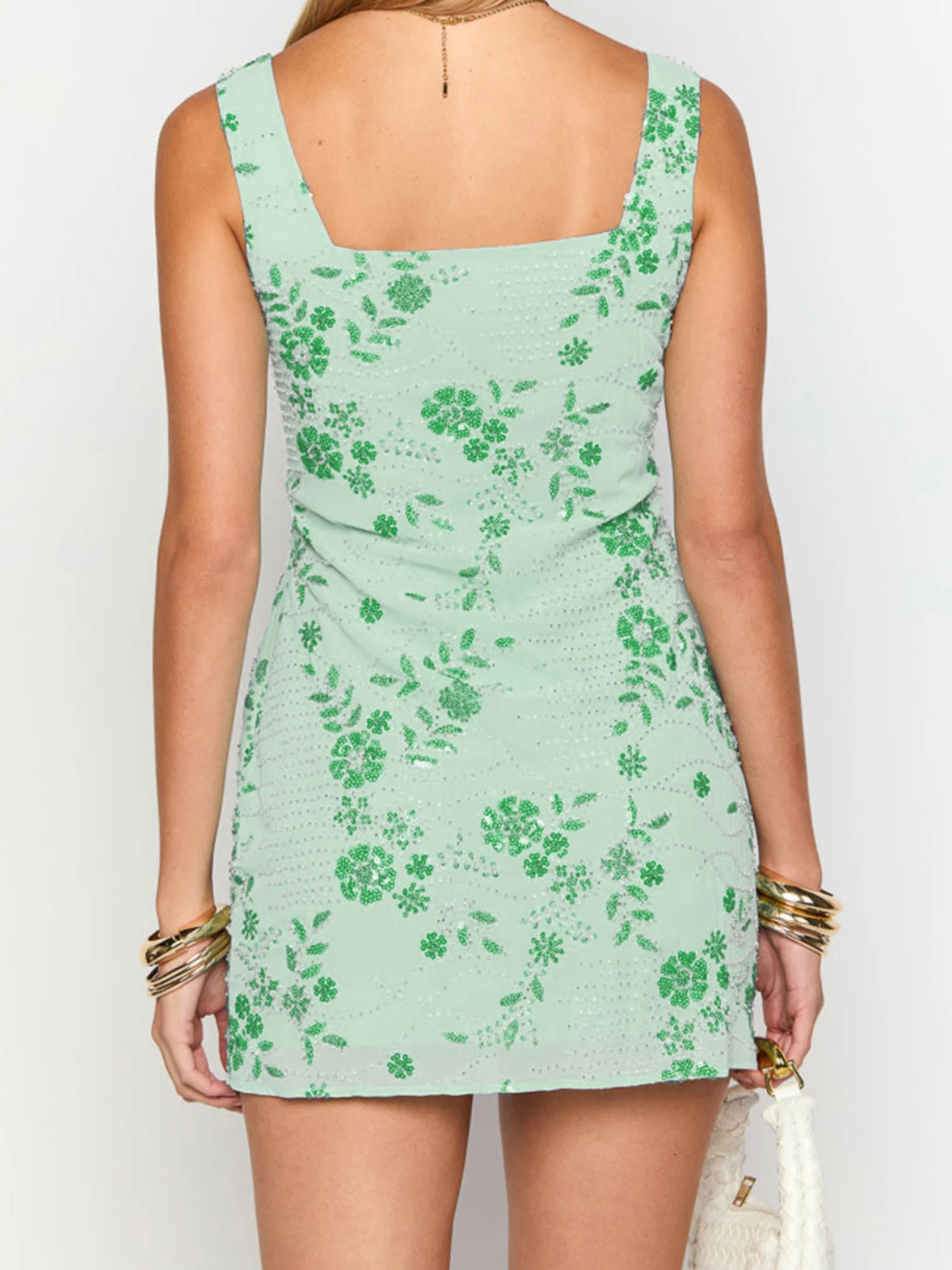 Sequin Tank Mini Dress for Women Summer Fashionable Square Neck Sleeveless Bodycon Floral Dress
