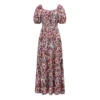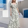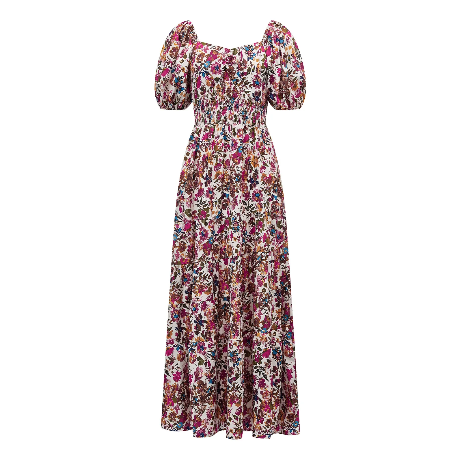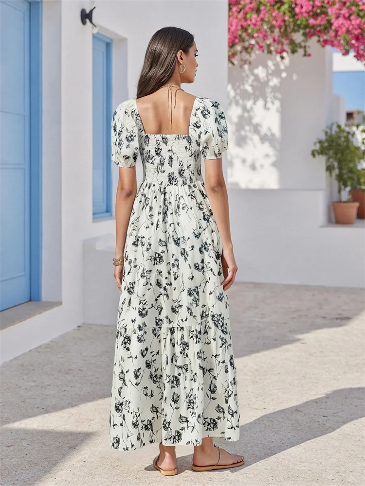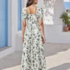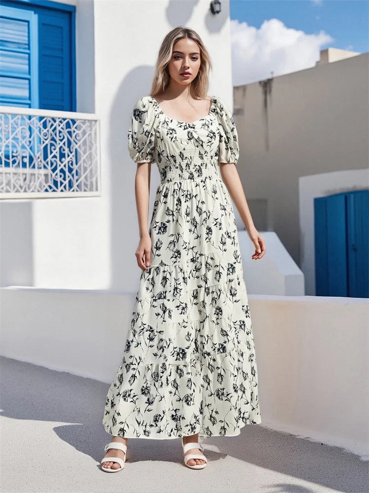 Floral print, sweetheart v-neck, bubble short sleeves, high waist, ruffle hem, A-line and ankle length design; Casual dress with sleeves; Elegant dresses for women, highlighting feminine charm