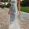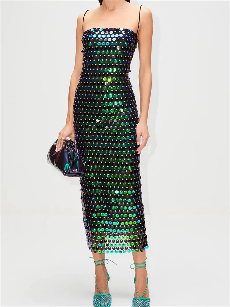 Women Midi Bodycon Dress Sequins Spaghetti Strap Sleeveless Sling Cocktail Dress Summer Backless Party Club Dress