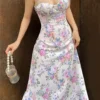 Women Sling Dress, Spaghetti Straps Low-cut Flower Print Summer Midi Dress for Party Vacation