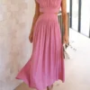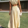 Women Summer Long Dress Solid Color Sleeveless Mock Neck Hollow Out A-line Dress Sexy Elegant Beach Holiday Loose Dresses