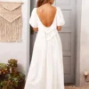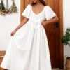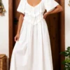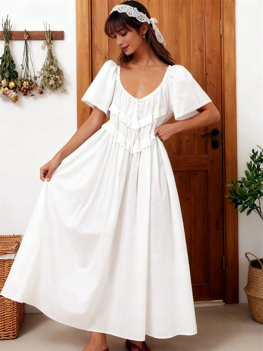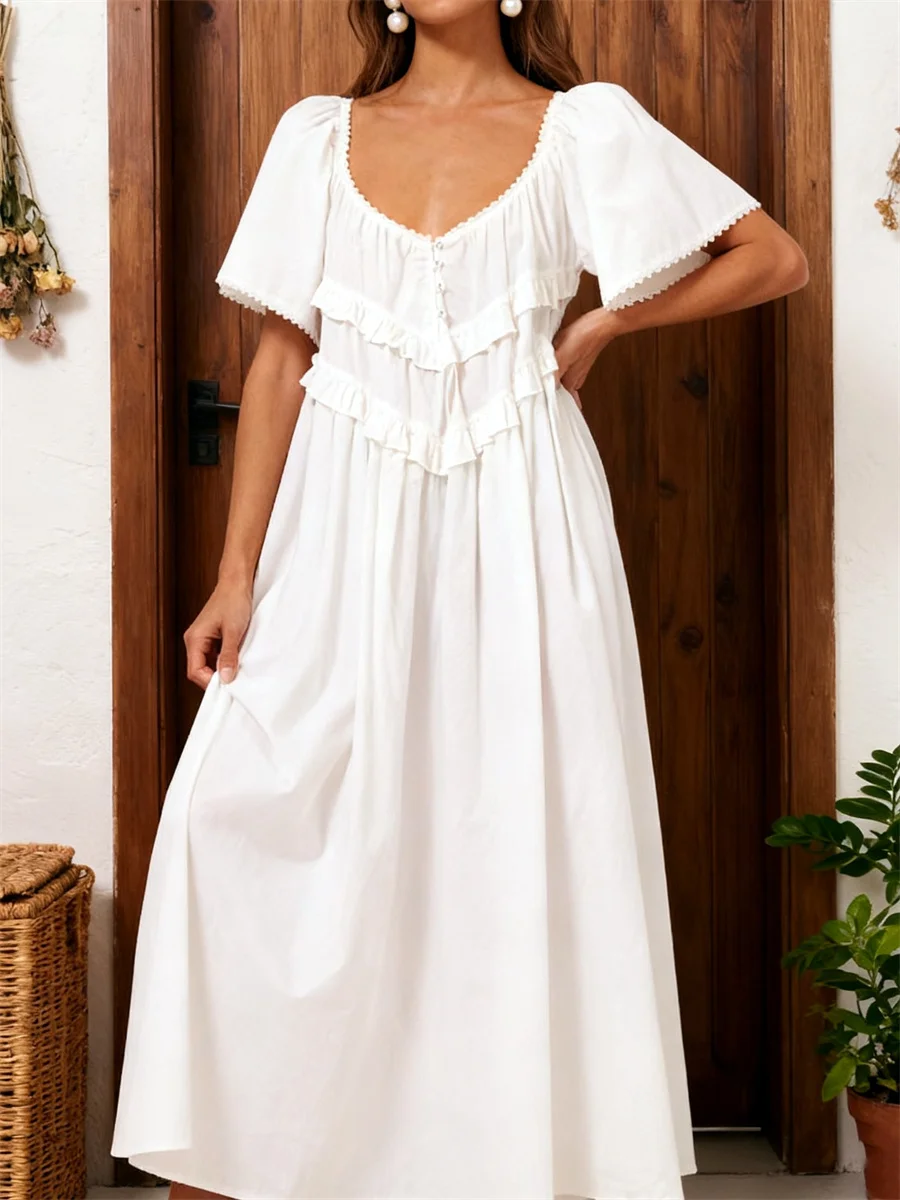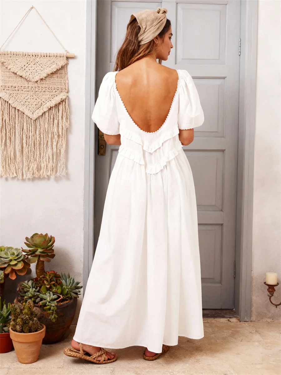 Women Long Dress, Elegant Short Sleeve Low-cut Backless Solid/Plaid Loose Swing Dress