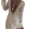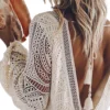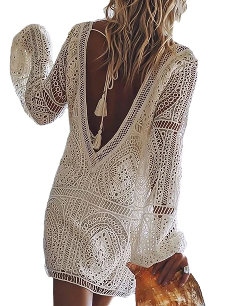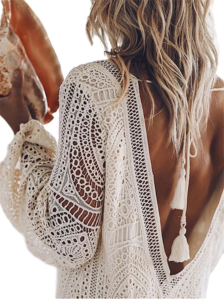 Women’s Lace White Dress Long Lantern Sleeve Deep V-neck Backless Mini Dress Casual Elegant Fall Dresses