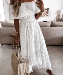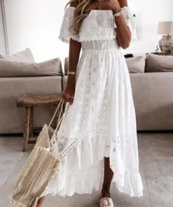 Women Bohemian White Long Dress Short Sleeve Off Shoulder Lace Ruffle Loose Dress Summer Holiday Beach Casual Dresses Female