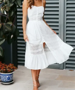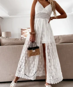 Summer Boho Long Dress Women Sleeveless Lace Pleated Beach White Dress for Evening Party Casual Dresses Vestidos Fashion