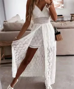 2025 Summer Women Lace Playsuit Dress Sleeveless V Neck Hollow Out Irregular Midi Dress Sexy Elegant Casual Bohemian Dresses