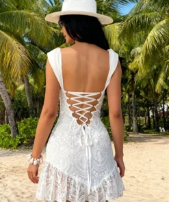Summer Women Lace White Dress Sleeveless V Neck Hollow Out Short Dress for Holiday Beach Casual Streetwear