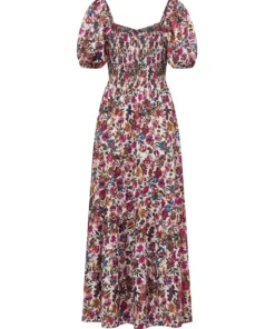Puff Sleeve Floral Long Dress Women Summer Short Sleeve Square Neck Lace-up Split Dress Casual Sexy Vintage Dresses Female 2024