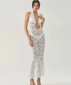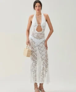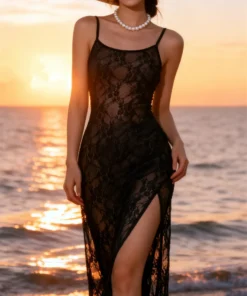Women Flower Lace Long Dress Sleeveless See Through Bodycon High Slit Dresses for Club Beach Sexy Cover-ups