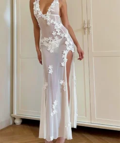 Women See Through Mesh Long Dress 2024 Summer 3D Flower Sleeveless V Neck Split Midi Dress Beach Club Sexy Dresses Cover-ups