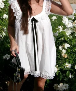 Women Mini Dress Lace Trim Fly Sleeve Bowknot Embellished Short Dress Summer Fashion Casual Dress
